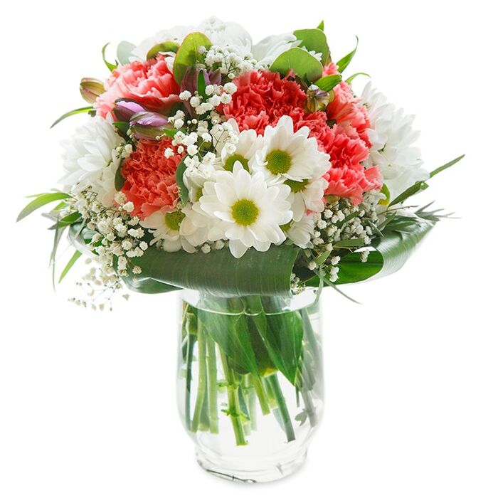 Bring a touch of elegance and beauty with our breathtaking seasonal flower arrangement. This unique bouquet combines pristine snow-white chrysanthemums, delicate gypsophila, and soft light pink carnations, all harmoniously arranged with aspidistra leaves.